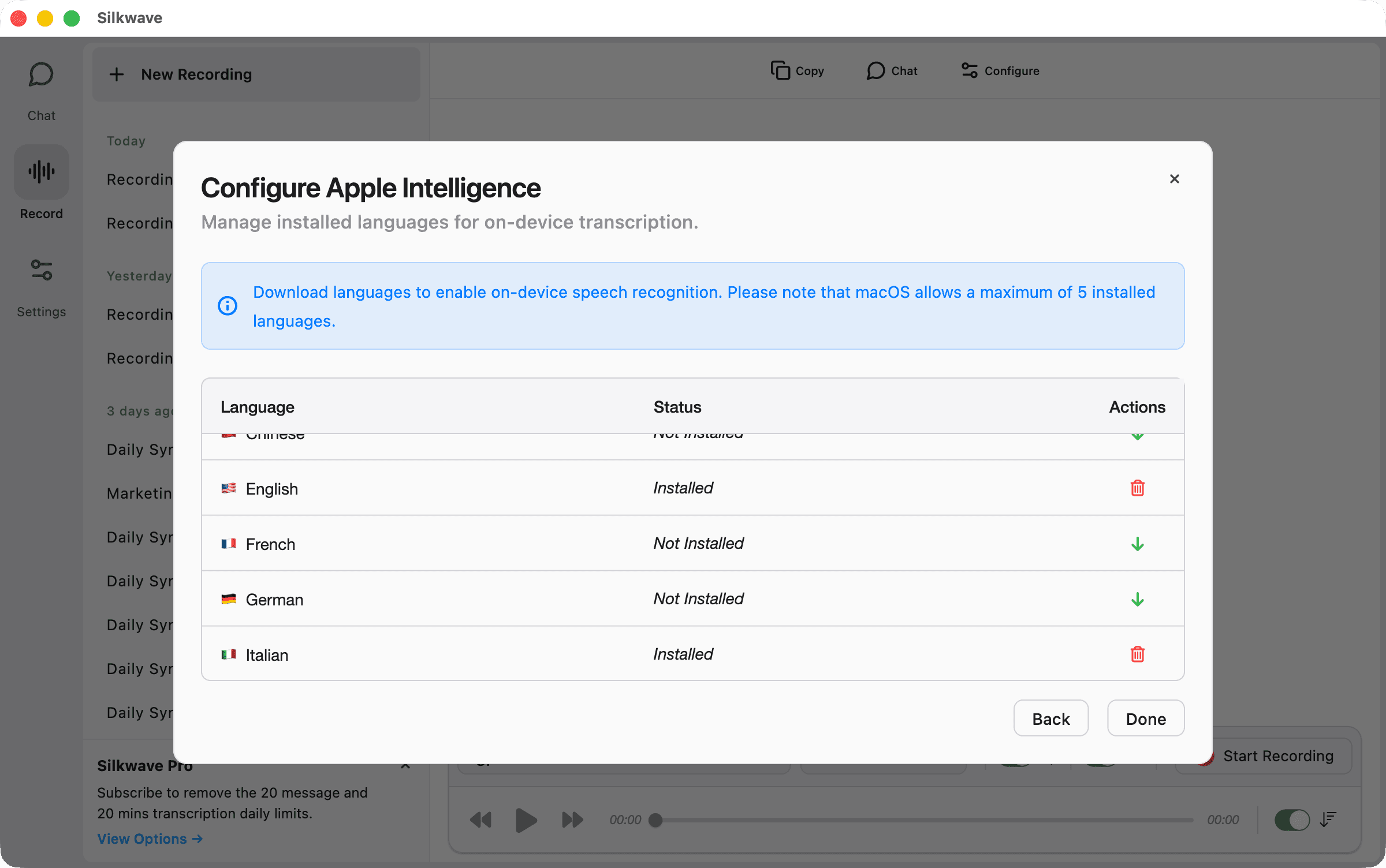 Silkwave leverages Apple Intelligence (macOS 26+) to transcribe the following languages on-device: